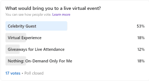 CTG put together a LinkedIn poll to determine what brings people to webinars, and we found that a celebrity appearance for attendees are the best motivational factors to use to get people to attend. 53% of our voters chose a celebrity guest as the top thing to bring them to a live virtual event. Other choices included in our survey were virtual experiences, gift incentives, or on-demand sessions only, but these were not as popular when compared to a celebrity guest.